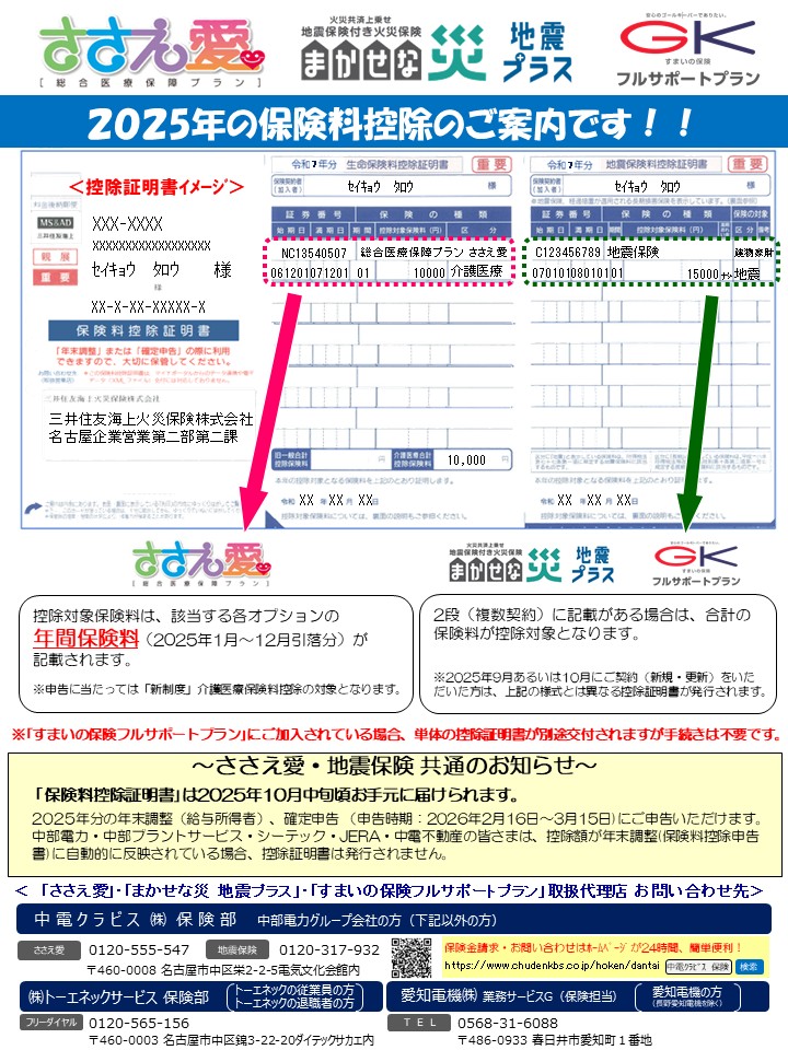 2025年の「総合医療保障プランささえ愛(生命保険料控除証明書)」と「まかせな災地震プラス・すまいの保険フルサポートプラン(地震保険料控除証明書)」の発送が始まりました。