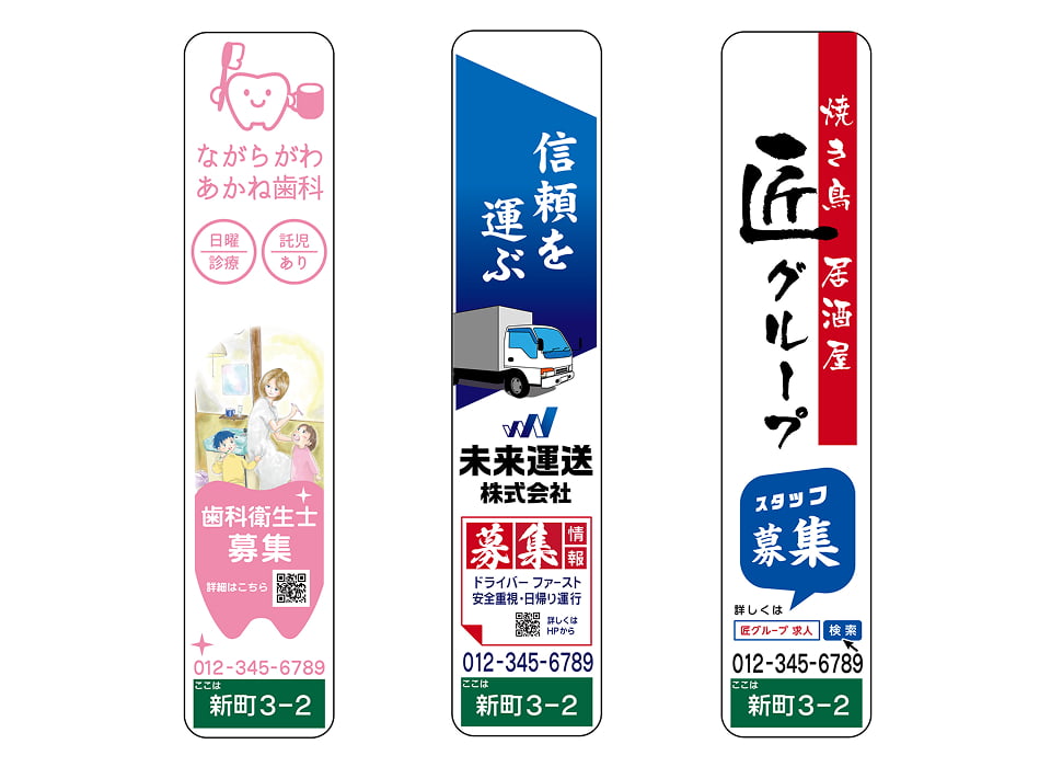 1 つの電柱に巻・袖セットで掲出することで、屋号とセールスポイントを分けたデザインなど、アイデア次第で、インパクトのある魅力的なPR ができます。